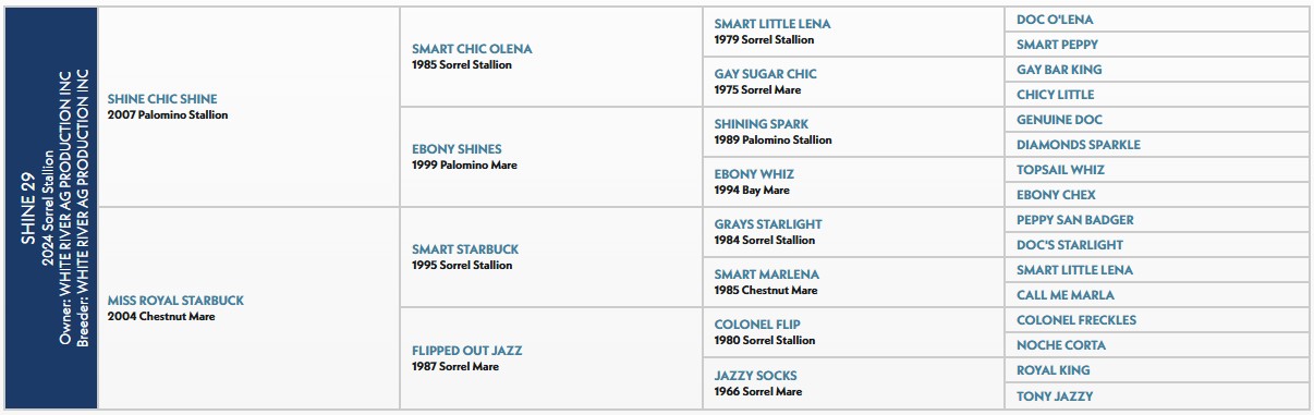 Shine 29 2024 Gelding Sire: Shine Chic Shine Dam: Miss Royal Starbuck $12,000 PEDIGREE Inquire about this horse Project navigationPreviousPrevious project:One True PlayerNextNext project:Spooks Got It All