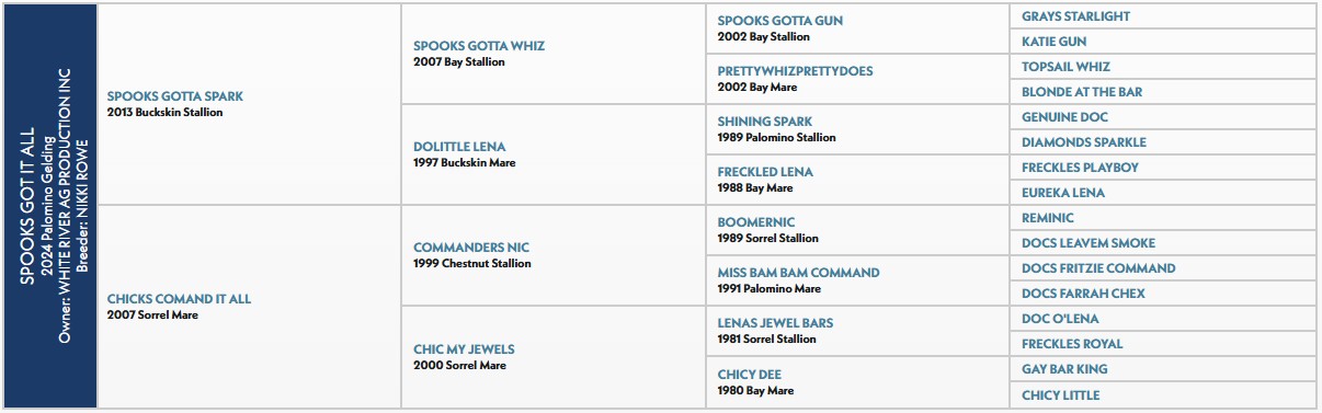 Spooks Got It All 2024 Gelding Sire: Spooks Gotta Spark Dam: Chicks Comand It All $10,000 PEDIGREE Inquire about this horse Project navigationPreviousPrevious project:Shine 29NextNext project:Current Obsession